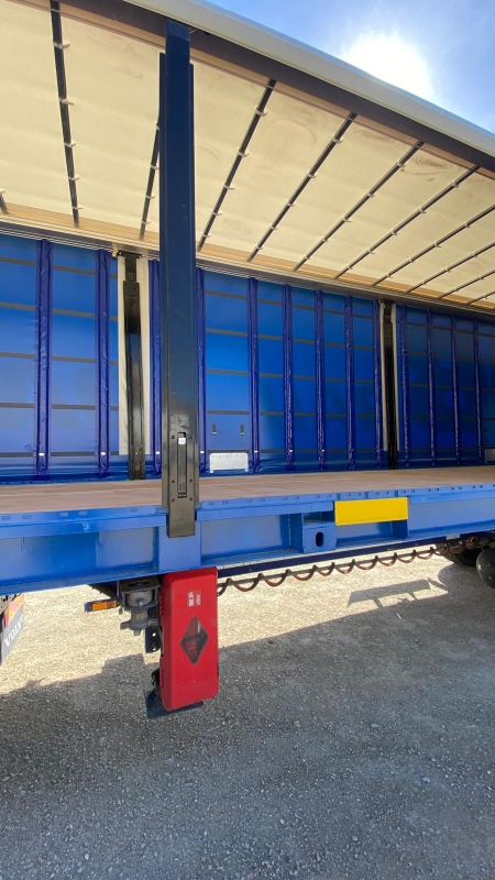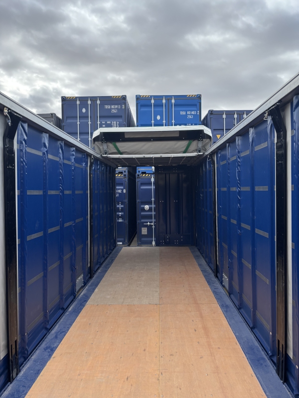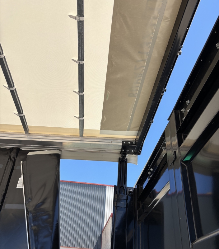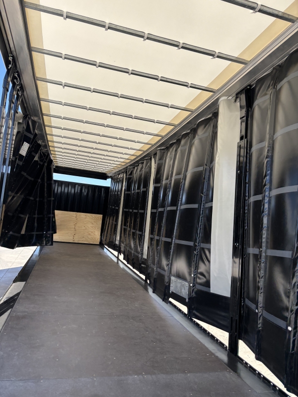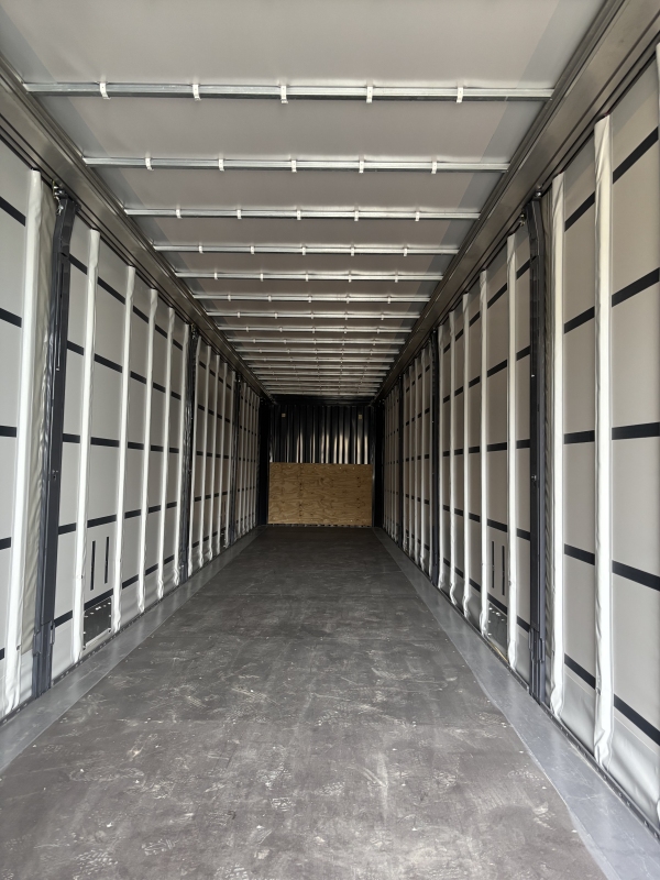 Caja móvil de 45 pies con laterales de lona y techo retráctil de lona. Diseño que permite cargar tanto por las puertas, como por laterales como por el techo.
